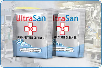 Ultrasan sachets combine a powerful blend of ionic and non-ionic detergents and organic chlorine disinfectant. The product is available in multiple formulations and sizes, making it ideal for environmental cleaning and disinfection in: